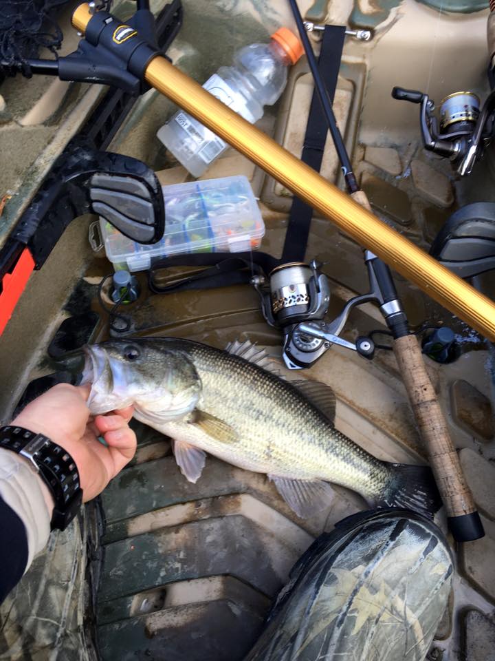 Still skeptical, we climbed in the yaks. The day started off in the mid-50s with wind below 5mph making for excellent fishing conditions. With the tip received from the angler who told me about the spot, he also showed me all his personal fishing holes. In the lead, I quickly paddled to the point where I was told about 5 pound lunkers, however I started just to the right of it, leaving room for drifting. Selfishly, I let Ryan go off to the left and fish from the other side of the small lake. Hey, you would do the same thing! Approaching the spot my left leg started to shake as I stood in the yak. I grabbed one of my three rods with my go to jig. Cast out about 15 feet letting the jig fall to the bottom. Jig….wait….jig….wait…..jig……FISH ON! Man did it hit. Immediately thoughts go through my head of catching fish after fish all day long! I yell with excitement over to Ryan….”Got one on first cast.” This, personally, was my first mistake and karma quickly set in. Reel in a what felt like a lunker to only land a small Crappie. Snap a pic and send it over to Ryan. By that point, the magician already started paddling his way over after catching a bass on the left side. I cast a few more times, nervously anticipating Ryan’s arrival. I catch a small bluegill and think dead hole. I’ll depart this area and drift over to the real spot, leaving this already over fished hole for Ryan. On my drift over to the left, I look and don’t see much structure but the hell with it I say. This is the spot I was told about. Cast after cast…nothing. That’s the exact point in time karma come back to get me full force. “Fish on”, Ryan yells. Not only do I feel like an idiot, Ryan gives me the full play by play. “The bass is pulling me around.”