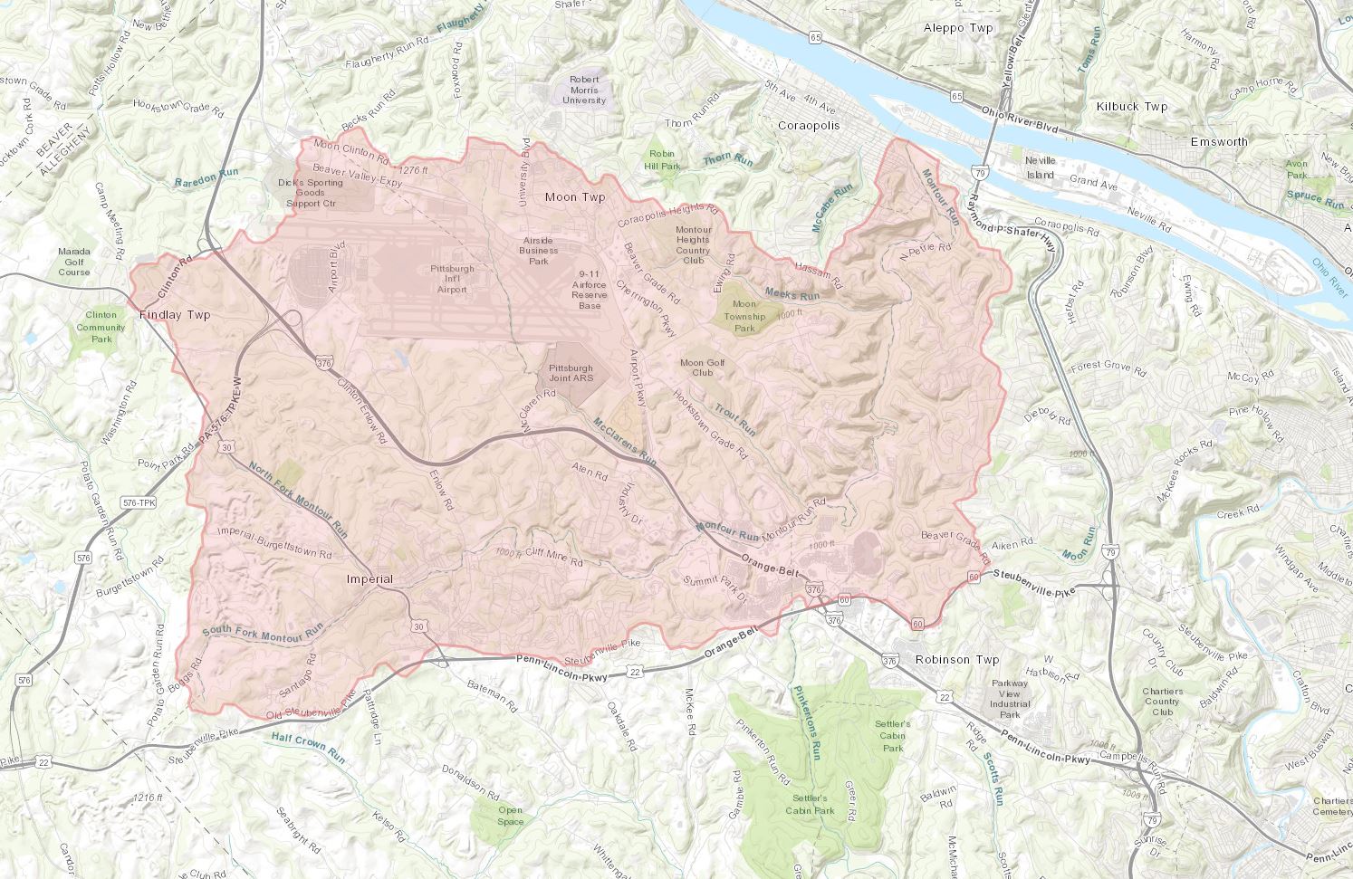 The Montour Run Watershed is located in the southwest corner of Allegheny County, approximately 12 miles from downtown Pittsburgh, and is comprised of portions of five different municipalities. Current land uses include Pittsburgh International Airport and military aviation, commercial and light industrial/office uses, and residential development. Historic uses have included agriculture, heavy industry, railroading, and coal mining.