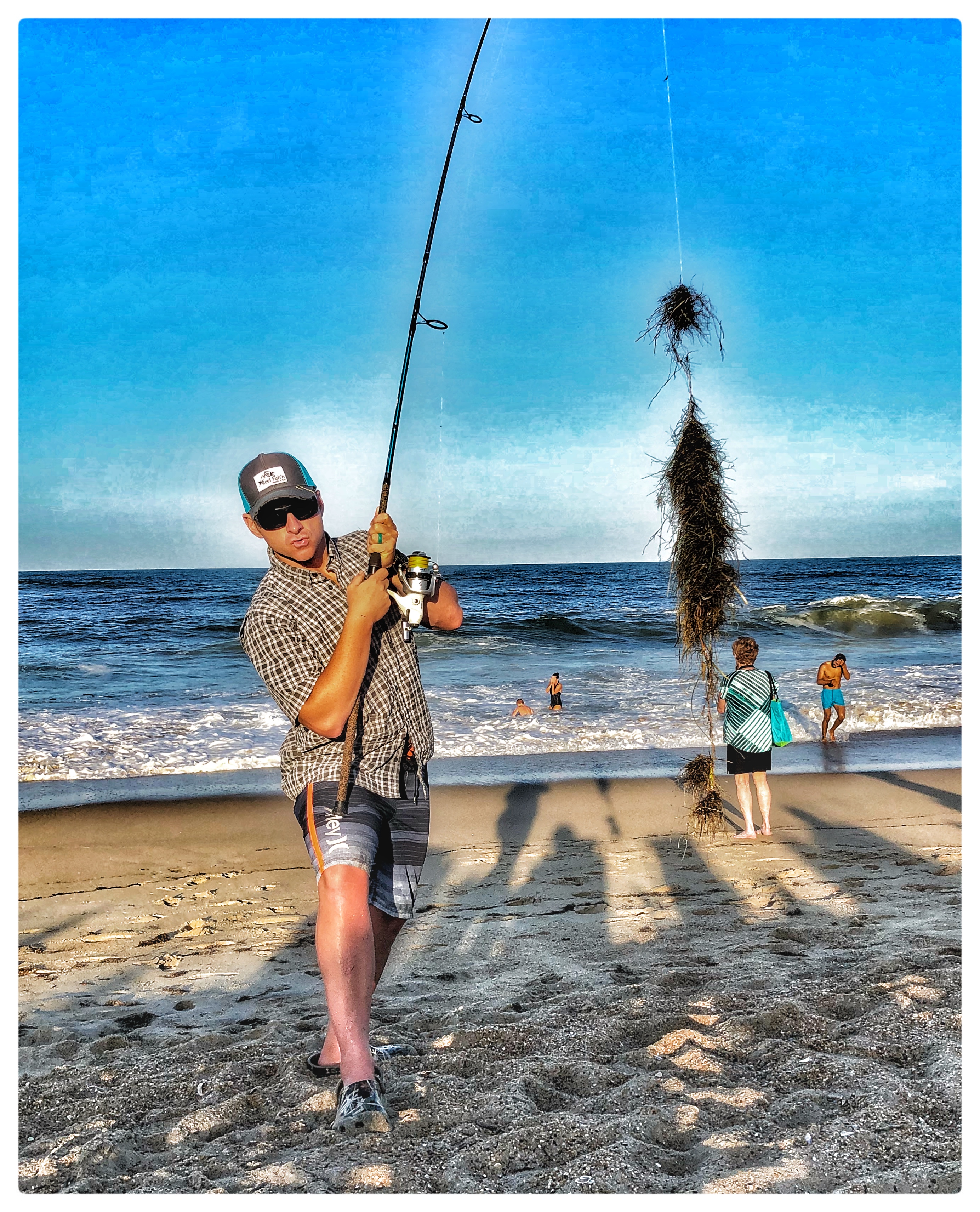 Wednesday & Thursday the surf was starting to settle down but still pretty murky. We tossed fresh bait from the surf out of the back of the house with zero luck. The ocean was polluted with green-brownish seaweed. To the point you could see it float as far as the eye could see. It made it extremely difficult to fish from surf so we just enjoyed some beers on the beach. Thursday morning we did a early morning trip to Oregon Inlet to fish around that area. We started fishing from the Bridge at daylight and caught small blues. The mullet bait fish feed was insane – the water was boiling with sea mullet and blues feeding on them. We tossed plastics and squid from the bridge and did pretty well. I had 3 hook rig setup and I caught a triple at once which was funny. After awhile the bridge was getting busy on the walkway and I could see the point where the ocean and bay met looked promising. I figured we could possibly catch some stuff in the surf with the bait we were using. We dropped some gear off at the truck and made our half mile hike out to the end poin